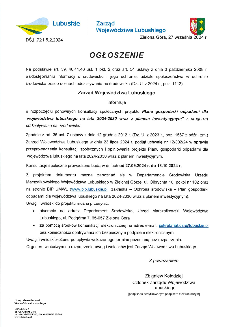 Ogłoszenie Zarządu Województwa Lubuskiego dotyczące rozpoczęcia ponownych konsultacji społecznych projektu „Planu gospodarki odpadami dla województwa lubuskiego na lata 2024-2030 wraz z planem inwestycyjnym”.