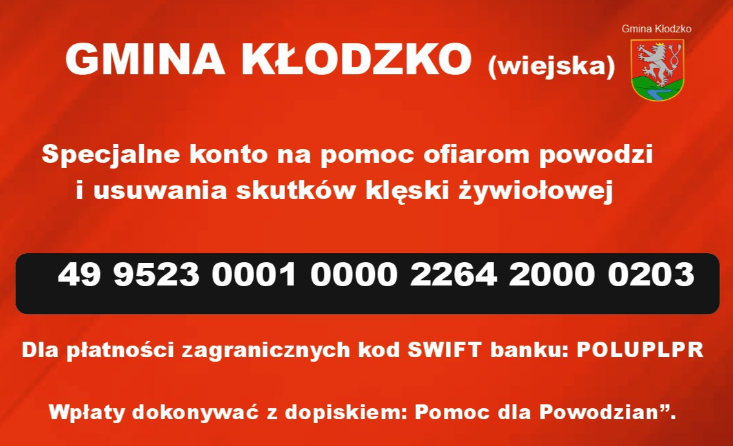 W obliczu klęski żywiołowej – powodzi, która dotknęła Gminę Kłodzko, Wójt Gminy Kłodzko Zbigniew Tur zwraca się z prośbą o wsparcie finansowe.
